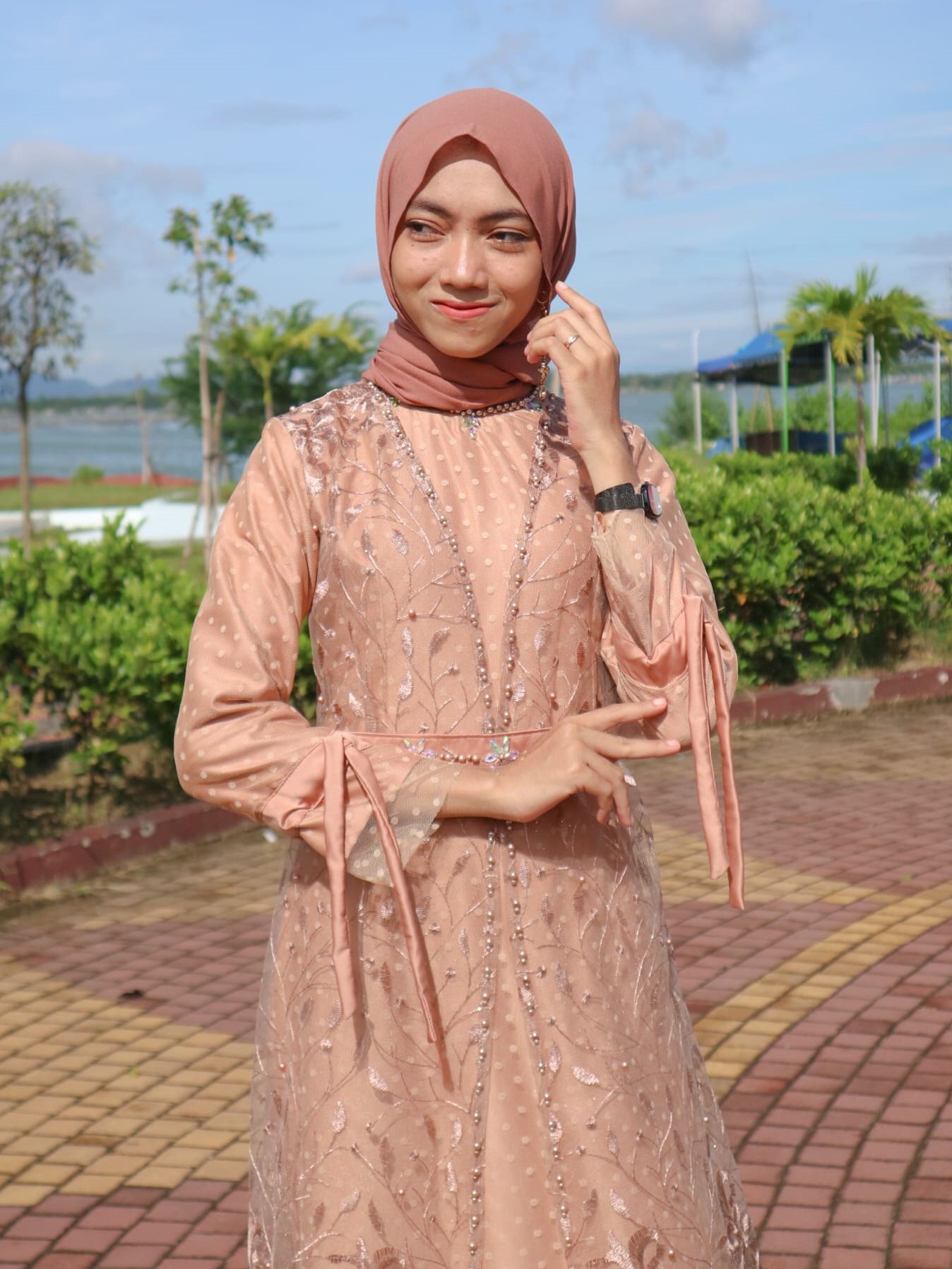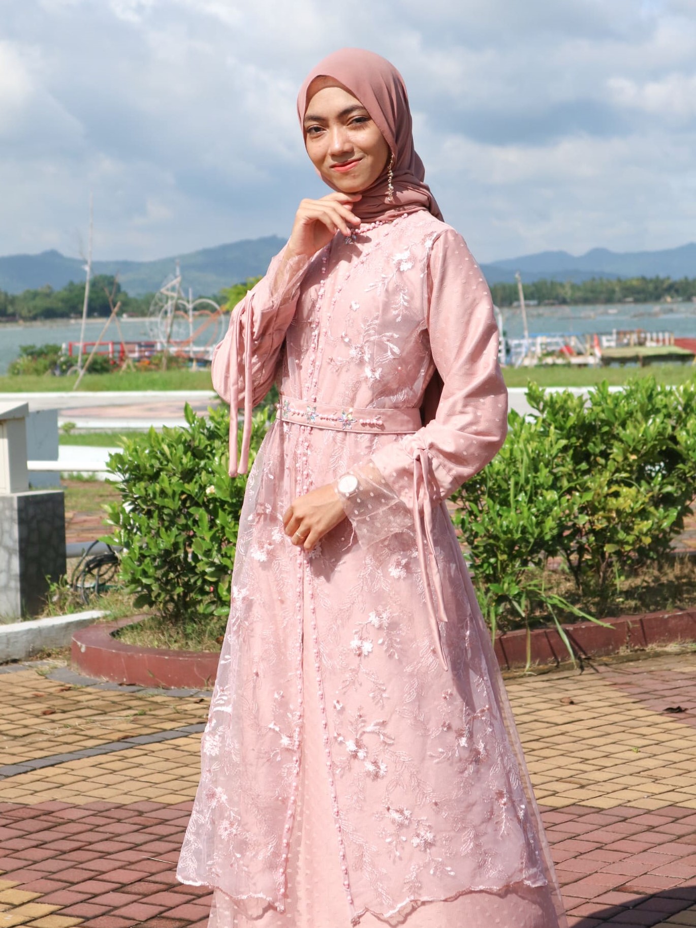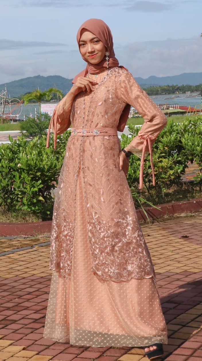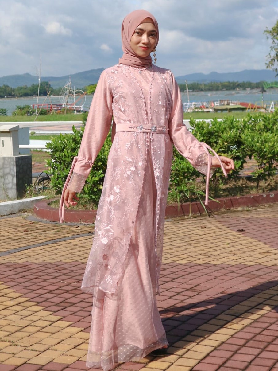 Dress model A dengan aksesori rompi yang mewah. Dilengkapi dengan serut dan belt yang dapat disesuaikan dengan bentuk badan.